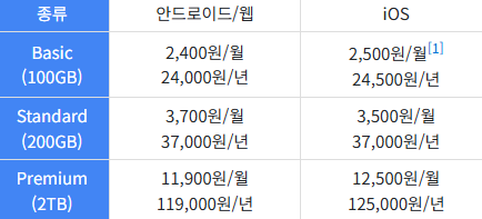 | 요금제 항목 | OneDrive | iCloud | Dropbox |